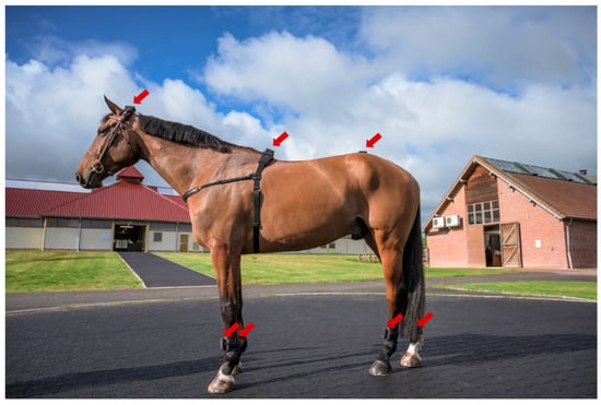 Horse equipped with EQUISYM® system, composed by sensors placed on the head, the withers, the pelvis and the four cannon bones (shown by the red arrows).