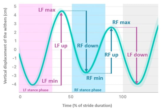 Mean vertical displacement (cm) of the withers plotted against time (expressed as % of stride duration) of a horse showing right forelimb (RF) lameness. Asymmetry Indices (AI) are: AI-min = RFmin-LFmin/LFup; AI-max = LFmax-RFmax/LFup; AI-up = LFup-RFup/LFup; AI-down = LFdown-RFdown/LFdown. (LF—Left Forelimb).