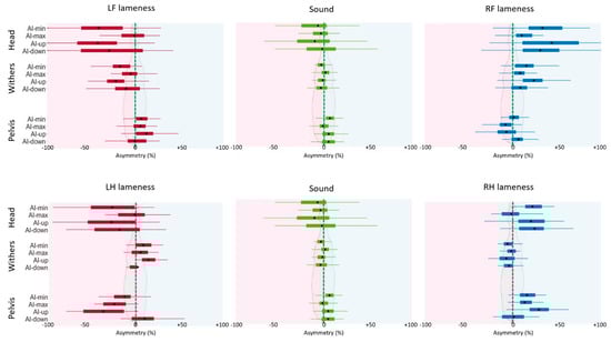 Means of the AIs in sound horses were close to 0% of asymmetry, particularly for the withers (AI-min = −3% ± 8%; AI-max = 2% ± 8%; AI-up = −1% ± 9% and AI-down = −3% ± 11%). The head (AI-min = −7% ± 29% and AI-up = −11% ± 29%) and pelvis (AI-min = 6% ± 8%, AI-up = 5% ± 13 % and AI-down = 5% ± 11%) showed higher absolute mean values than the withers. The negative sign of AIs for the withers and the positive sign of AIs for the pelvis expressed reduced range of movement during the LF and RH stance phase.
