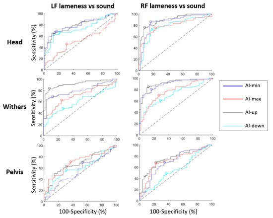 With a sum of sensitivity and specificity over 150%, head (AI-min_H and AI-up_H) and withers (AI-min_W and AI-up_W) indices discriminated the LF lame horses from sound horses. As well, head (AI-min_H, AI-max_H, AI-up_H, and AI-down_H) and withers (AI-min_W and AI-up_W) indices discriminated the RF lame horses from sound horses.