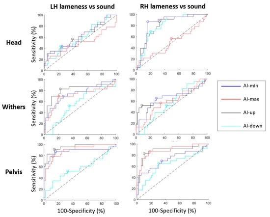 With a sum of sensitivity and specificity over 150%, withers (AI-up_W) and pelvis (AI-min_P, AI-max_P, and AI-up_P) indices discriminated the LH lame horses from sound horses. As well, head (AI-min_H and AI-up_H) and pelvis (AI-max_P and AI-up_P) indices discriminated the RH lame horses from sound horses.