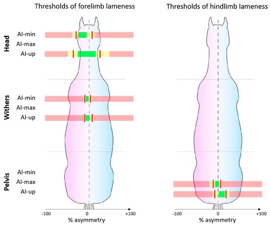 Main results give the following guidelines: associated with the highest sensitivity and specificity, AI-up_W discriminates LF lame horses under −10% of asymmetry and RF lame horses over +7% of asymmetry from sound horses. Associated with the highest sensitivity and specificity, AI-up_P discriminates LH lame horses under −7% of asymmetry and RH lame horses over +18% of asymmetry from sound horses. These observations confirm that the upward movement of the pelvis has the highest power to discriminate hindlimb lameness [30].
