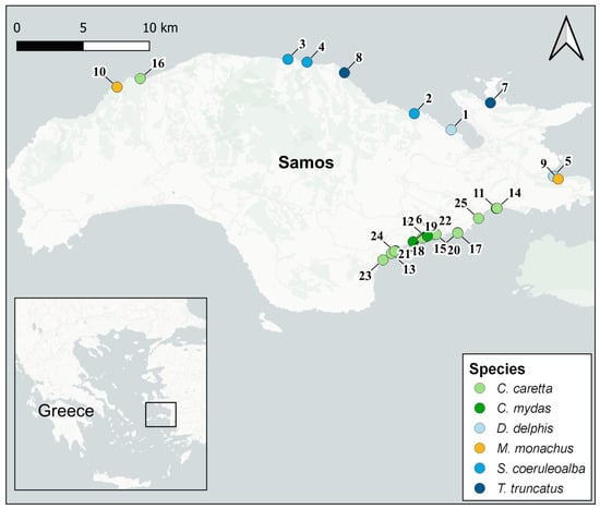 Samos is a Greek island located in the north-eastern Aegean Sea with approximately 140 km of coastline. The island is included in the Central Aegean Important Marine Mammal Area [] and is confirmed as an important habitat for cetaceans [] and seals []. The Aegean Sea is also listed among the areas of the Eastern Mediterranean considered as critical since it has the largest percentage of oceanic foraging grounds for loggerhead turtles []. During the period of 2018–2019, 25 specimens found stranded along the shore of Samos Island were selected for this study: 15 marine turtles, family Cheloniidae [9 Caretta caretta (Linnaeus, 1758) and 6 Chelonia mydas (Linnaeus, 1758)]; 2 Mediterranean monk seals, family Phocidae [Monachus monachus (Hermann, 1779)]; and 8 cetaceans, family Delphinidae [3 Delphinus delphis (Linnaeus, 1758), 3 Stenella coeruleoalba (Meyen, 1833) and 2 Tursiops truncatus (Montagu, 1821)] (Figure 1; Table 1).
