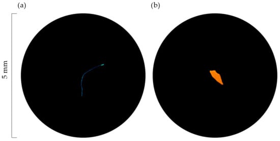Particles retained in each filter were observed using a dissecting microscope (AmScope Compact Multi-Lens Stereo Microscope 20X-40X). Following the method described by Hidalgo-Ruz et al. [], particles were identified as MPs when no organic structures were observed, a homogenous colour was exhibited and a uniform thickness was visible. In addition, the particles were tested using a hot needle [], as plastic compounds melt or curl when heated. Therefore, such particles are hereinafter addressed as MPs. When unsure, the particles were not classified as MPs and thus excluded from the analysis. MPs were counted, classified by colour and type (fibre or fragment) (Figure 2), measured (using a micro ruler) and grouped into 5 size categories: ≤0.20 mm; 0.21–0.50 mm; 0.51–1.00 mm; 1.01–2.50 mm; 2.51–5.00 mm.