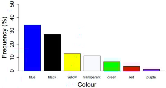 Colours of MPs found expressed as the frequency of occurrence in the entire dataset. Only colours with a proportion higher than 1% are shown.