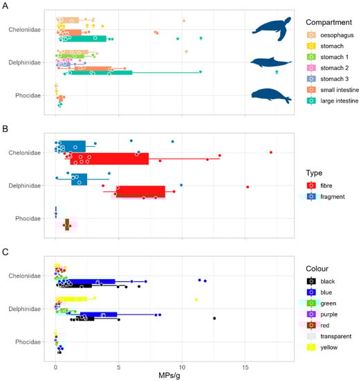 The most common sizes of MPs recorded in our study were 0.21–1.00 mm. Synthetic particles < 1.00 mm were identified in all marine turtles analysed by Duncan et al. [], with higher numbers in the Mediterranean Sea []. In our study, MPs < 0.50 mm were overrepresented, and drove the difference between Cheloniidae and Delphinidae. The high amount of smaller size particles could be related to the breaking down action of the transit and digestive process []. The majority of MPs detected in Cheloniidae and Delphinidae were fibres, as reported in other studies [,,,,]. This type of MP has been found in almost every marine habitat around the globe [,]. The predominant colours of the detected MPs were blue and black, which frequently dominates the composition of particles ingested by fish and marine mammals [,,].