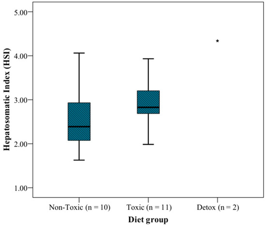 Hepatosomatic index (HSI) of the different diet groups. The plot represents the interquartile range (Q3–Q1), and the dark line draws the median values. * Indicates the mean value of the detox group.