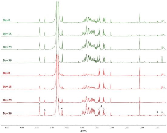 Effect of diet on the metabolic profile of liver tissues. Representative 1H NMR spectra (500 MHz, 298 K) of the liver samples of Carassius auratus fed with CTX-toxic (red) and non-toxic (green) fish diet. Effect of time of treatment after 36 days. Key metabolites: (1) lactate, (2) alanine, (3) taurine, (4) α-glucose, (5) β-glucose, (6) glycogen.