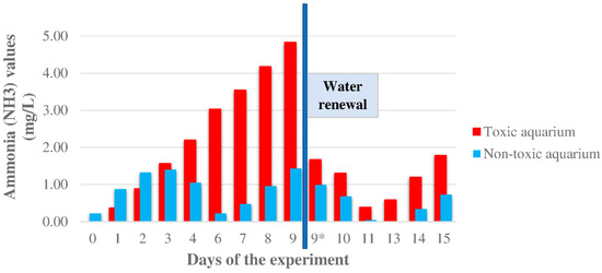 On day 9, the water was renewed due to the high ammonia values detected to ensure the welfare of the animals. To ensure equal conditions, the same amount was replaced in both aquaria (75% of the total). Besides NH3, other water parameters were checked to guarantee good aquarium conditions, as shown in Tables S3 and S4.