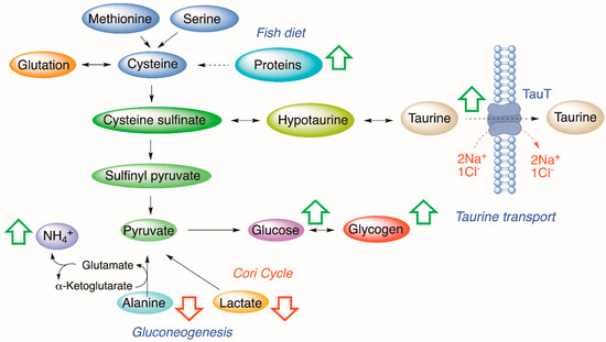 On the other hand, nutritional studies with marine fish species have revealed that diets supplemented with taurine restored the activity of amino acid catabolic and gluconeogenic enzymes and hexokinase to control levels [39,40]. Despite the fact that the taurine effect on glucose homeostasis has been little studied, it may be of special interest, particularly for carnivorous fish species. Actually, carnivorous fish are traditionally considered to be glucose intolerant due to prolonged hyperglycemia observed after a high glucose intake [39,41,42,43].