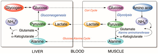 Most of the observed metabolic alterations seem to be related to the glucose–alanine cycle (Figure 5), which correlates with the metabolism of glucose in muscle and liver in mammals. Alanine is another source of gluconeogenesis in the liver and is produced from the transamination process in non-hepatic tissues. During transamination, one α-amino acid donates the amino group and generates one α-keto acid. Through the glucose–alanine cycle, the non-hepatic tissues transfer the amino moiety of the catabolized amino acids to the liver to be excreted as urea; therefore, nitrogen is eliminated from muscles while replenishing its energy supply [49]. Assuming similar metabolic pathways in fish liver, the detected effects suggest an activation of gluconeogenesis that leads to the reduction of lactate and alanine in hepatic cells; therefore, an increment of glucose, glycogen, and NH4+, as NH3 in water, is detected in treated fish.