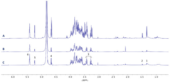 Analysis of liver detoxification. Comparison of 1H NMR spectra (recorded at 500 MHz, 298 K) of the liver samples of Carassius auratus. (A) Control fish fed with a commercial diet. (B) Fish fed with 43 days of toxic diet with severe symptoms. (C) Fish fed with commercial diet for 60 days after 43 days of toxic diet and severe symptoms. Key metabolites: (1) lactate, (2) alanine, (3) taurine, (4) α-glucose, (5) β-glucose, (6) glycogen.