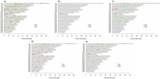 Plot of copy number variation regions (CNVR) on 31 horse (Equus caballus) autosomes. (a) Total CNVR distribution; (b) Jeju horse CNVR distribution; (c) Thoroughbred CNVR distribution; (d) Jeju riding horse CNVR distribution; (e) Hanla horse CNVR distribution. Red, green, and black represent gains, losses, and mixed CNVRs, respectively.