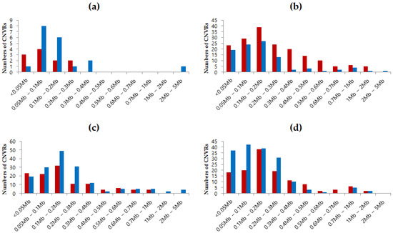 Gain and loss distribution by length of CNV region (CNVR) in four horse breeds in South Korea. (a) Jeju horse CNVR distribution; (b) Thoroughbred CNVR distribution; (c) Jeju riding horse CNVR distribution; (d) Hanla horse CNVR distribution. Red and blue represent losses and gains, respectively.