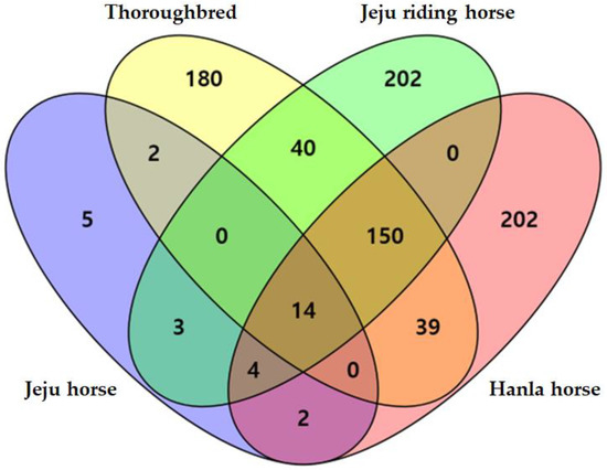Among the 843 CNVRs, 589 (70.6%) were specific CNVRs that did not overlap with other breeds and appeared only in each breed as follows: Jeju horses (n = 5), which had the fewest specific CNVRs, Thoroughbreds (n = 180), Jeju riding horses (n = 202), and Hanla horses (n = 202) (Figure 3, Table S2). Because Jeju riding horses and Hanla horses are crossbreeds produced by hybridizing Jeju horses and Thoroughbreds, we can expect these two breeds to exhibit significant characteristics in CNVRs. The majority of horse breeds were of recent origin and had undergone significant crossbreeding before closed breeds were founded, which has resulted in a high level of haplotype sharing [6,36], and thus fewer breed-specific CNVRs can be found than crossbred [37].