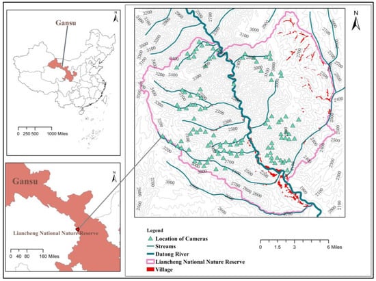 The LNNR(102°36′–102°55′ E,36°33′–36°48′ N, Figure 1) is located in the transition zone between the northeastern Qinghai-Tibet Plateau and western Loess Plateau. The reserve was established in 2001 and covered a total area of 479.3 km2. The elevation ranges from 1870 to 3616 m. The region has a typical temperate continental climate with a mean annual temperature of 7.4 °C; a mean annual precipitation of 419 mm, which is mostly concentrated between June and September every year, with occasional snowfall in the winter; and a mean annual evaporation level of 1542 mm. The Datong River runs through the reserve from north to south, with numerous ravines distributed on the river sides. The reserve preserves a large area of primeval Qinghai spruce (Picea crassifolia) forest and Sabina chinensis (Sabina przewalskii) forest and distributes seven types of vegetation forms, including deciduous broad-leaved forest, temperate coniferous forest, temperate coniferous and broad-leaved forest, cold-temperature coniferous forest, cold-temperature coniferous and broad-leaved forest, deciduous broad-leaved shrubland and temperate grass and weed meadow. A variety of vegetation types contribute to the multiple biotope and abundant animal species. According to a comprehensive scientific survey completed in 2018 (unpublished), there are 23 orders, 60 families and 190 terrestrial vertebrates, among them there are 5 orders, 16 families, 33 mammalian species and 16 orders, 37 families, 148 bird species including 9 Galliformes. According to the IUCN Red List, the endangered species include Dhole (Cuon alpinus), alpine musk deer (Moschus chrysogaster), forest musk deer (M. berezovskii) and saker falcon (Falco cherrug); vulnerable species include the Chinese mountain cat (Felis bieti) and Eastern imperial eagle (Aquila heliaca); and near-threatened species include the Eurasian otter (Lutra lutra), Chinese grouse (Bonasa sewerzowi) and cinereous vulture (Aegypius monachus) [18].