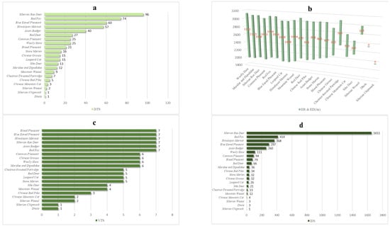 The number of independent detections of species in Figure 2d shows that the top five species of independent detections are Siberian roe deer (IDS = 1651), red fox (IDS = 414), Himalayan marmot (IDS = 368), blue eared pheasant (IDS = 297) and Asian badger (IDS = 260), and the number of independent detections less than 10 are Siberian chipmunk (IDS = 1), Dhole (IDS = 3), Siberian weasel (IDS = 3) and Chinese mountain cat (IDS = 4).