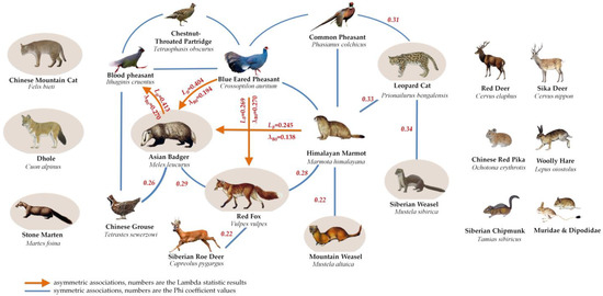 Symmetric associations–competitive relations are observed between the leopard cat and Siberian weasel, leopard cat and Himalayan marmot, leopard cat and common pheasant, red fox and Asian badger, red fox and Himalayan marmot, Asian badger and Chinese grouse, red fox and Siberian roe deer and Himalayan marmot and mountain weasel.