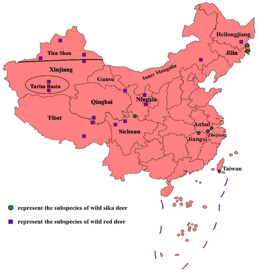 Distribution landscape of wild velvet deer in China. Green circles represent the distribution of subspecies of wild sika deer and purple squares represent the distribution of subspecies of wild red deer.