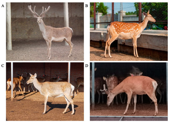 China is rich in deer resources, with 21 species, which accounts for 41.7% of deer species in the world [1]. Sika deer and red deer are two species belonging to the same cervus. They are the main velvet deer species in China because of their superior pilose antler production performance [2]. They are widely distributed in China. Sika deer are distributed in the northeast and south, while red deer are mainly distributed in the northwest (Figure 1).