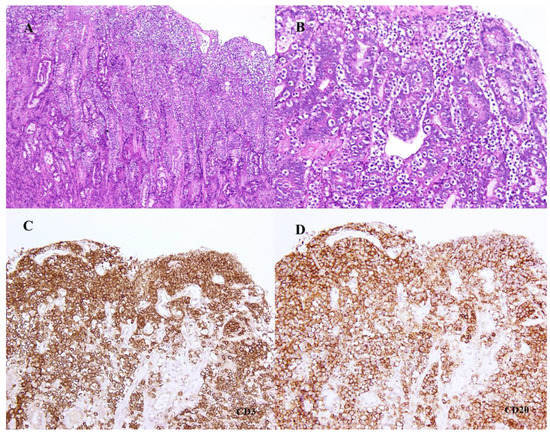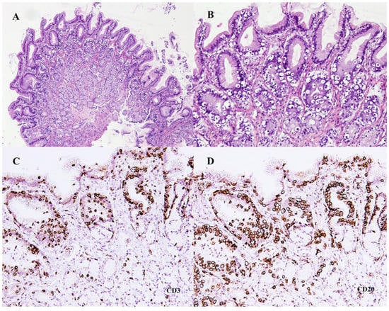 (A,B) Microphotographs of endoscopic biopsies of gastric pyloric mucosa showing infiltration of the superficial epithelium and one of the crypts by small lymphocytes (H&E, (A) ×40 and (B) ×100). (C,D) Immunohistochemistry for lymphoid T-cells (C) (anti-CD3) and B-cells (D) (anti-CD20) (Mayer’s hematoxylin, ×100).