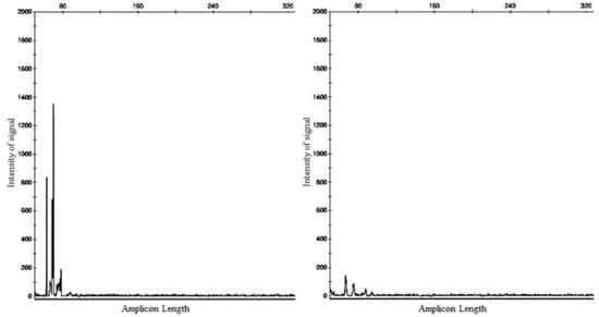 Molecular clonality analysis performed on DNA extracted from paraffin blocks using capillary electrophoresis in the 3500 Genetic Analyzer (Applied Biosystems®). Results show clonal amplification with a 55–82 bp peak of the T-cell receptor (TCRγ) on the lower left and negative or poor amplification for the B-cell receptor (IgH) on the lower right after using the PARR technique protocol. The x-axis is the length of the amplicon, and the y-axis is the intensity of the signal.