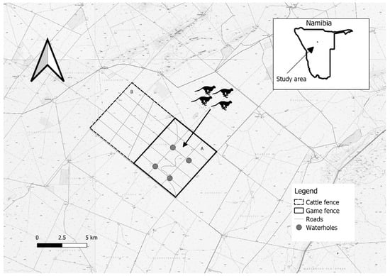 Map of Bellebenno game reserve, Namibia with four man-made waterholes, dirt roads, and game fence included. The study occurred in section A, which is a managed as a reserve, whereas section B operates as a cattle farm.