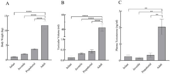 Body weight (A), testicular volume (B), and plasma testosterone levels (C) of infant (n = 3), juvenile (n = 4), prepubertal (n = 4), and adult (n = 4) male rhesus monkeys. All data are presented as the mean ± SEM. ** p < 0.01, **** p < 0.0001.