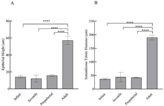 Mean ± SEM epithelial height per tubule (A) and seminiferous tubular diameter (B) of male rhesus monkeys through postnatal development. **** p < 0.0001.
