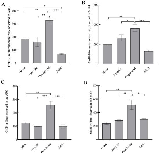 GnIH-like immunoreactive nerve terminals that were observed in arcuate area (A), MBH (B); and GnIH-like-ir fibers in arcuate area (C) and MBH (D) of male rhesus monkeys through pubertal development. * p < 0.05, ** p < 0.01, *** p < 0.001, **** p < 0.0001.