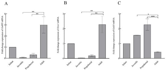 The mean ± SEM hypothalamic fold change expression of GnRH (A), Kiss1 (B), and GnIH (C) mRNA during pubertal development in male rhesus monkeys. * p < 0.05, ** p < 0.01, *** p < 0.001.