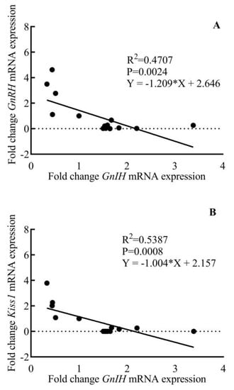 Inverse age-related correlation between hypothalamic fold change GnRH (A) and Kiss1 (B) expression with GnIH expression during pubertal development in male rhesus monkeys.