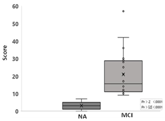 The scores obtained by dogs classified as having MCI were significantly different from the score obtained by dogs in the group of NA (p < 0.0001) (Figure 2).