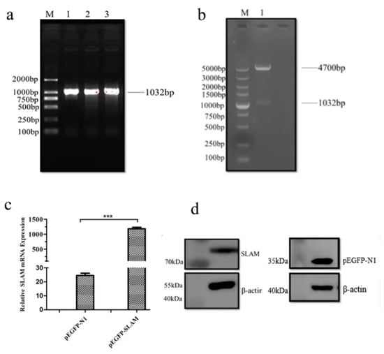The SLAMF1 gene fragment was detected by agarose gel electrophoresis and showed a bright band at 1032 bp (Figure 1a). Double enzyme digestion was used to identify the selected single-colony plasmid, and agarose gel electrophoresis showed two bands consistent with the expected size (Figure 1b), indicating that SLAMF1 had successfully inserted into the PEGFP-N1 vector. The qRT-PCR results indicate that the mRNA expression of SLAMF1 was significantly increased by pEGFP-N1-SLAMF1 (p < 0.001) (Figure 1c). The protein expression of the EGFP-labeled SLAM gene was detected by western blot, which was consistent with the predicted protein size (80 kDa), with the band size of the empty vector being about 27 kDa. The WB results also indicate that the protein level of SLAMF1 was increased by pEGFP-N1-SLAMF1 (Figure 1d).