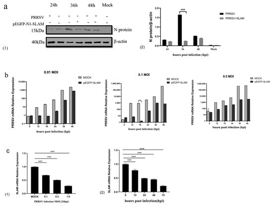 Overexpression of SLAM inhibits PRRSV replication. (a1) Expression of PRRSV−N protein at different time points after PRRSV infection. (a2) The protein expression of SLAM in infected Marc-145 cells at different time points; (b) Effect of overexpression of SLAM and infection with different MOI of PRRSV on PRRSV proliferation at different time points. (c) qRT-PCR for detecting the differential expression multiple of SLAM gene at different time points and different titers after PRRSV infection at 24 h. (c1) Differential expression multiple of PRRSV-infected 24 h SLAM gene with 0.1–1 MOI. (c2) 0.1 Differential expression multiple of SLAM gene 0–72 h after MOI PRRSV infection. Note: *** means extremely significant difference (p < 0.001).