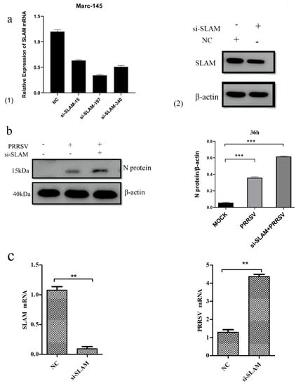 Knockdown of SLAM enhances PRRSV replication. (a1) Different synthetic si-SLAM interfering plasmids were transfected into Marc-145 cells, and the mRNA level of the SLAM gene was detected by qRT-PCR 24 h later. (a2) Si-SLAM-197 was transfected into Marc-145 cells, and the changes in the SLAM gene in the cells were detected by western blot 24 h later. (b) Effect of SLAM gene on PRRSV proliferation was detected by western blot. (c) Effect of siRNA interference SLAM gene on PRRSV proliferation was detected by qRT-PCR. Note: ** means significant difference (p < 0.01), *** means extremely significant difference (p < 0.001).