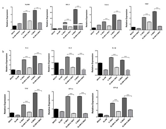 qRT-PCR was used to detect the expression levels of key signaling molecules in Marc-145 cells with SLAMF1 expression and PRRSV infection. The results show that overexpression of SLAMF1 inhibited the proliferation of PRRSV, and the levels of key signaling pathways MyD88, RIG-I, TLR2, and TRIF in cells were significantly inhibited (p < 0.001) (Figure 4a). The expression levels of cytokines IL-6, IL-1β, IL-8, TFN-β, TNF, and IFN-α were significantly lower (p < 0.001) than those in the PRRSV-infected group (Figure 4b).