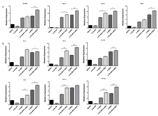 The qRT-PCR results show that, after si-SLAMF1 promotes the proliferation of the PRRSV, the expression levels of the key signaling pathways TRIF and TLR2 were significantly (p < 0.05) higher than those of the PRRSV-infected group, and the expression level of MyD88 was extremely significantly (p < 0.01) higher than that in the PRRSV-infected group (Figure 5a). The expression level of IL-6 was significantly (p < 0.05) higher than that in the PRRSV-infected group, and the expression level of IFN-α was extremely significantly (p < 0.001) higher than that in the PRRSV-infected group (Figure 5b).