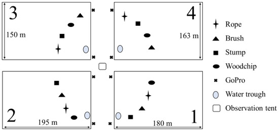 Schematic of the 4 experimental paddocks (1–4) showing sizes and location of enrichments (rope, brush, stump, woodchip pile), water troughs, GoPro cameras, and observation tent. Paddocks 1 and 4 were the same dimensions (160 m × 180 m), and paddocks 2 and 3 were the same dimensions (150 m × 195 m). Not drawn precisely to scale.