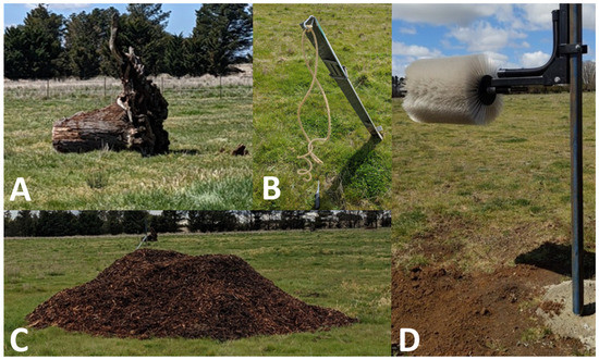 Four neighbouring paddocks approximately 3 hectares each in size were used. Each contained a water trough and four enrichments, which were positioned 30–35 m apart in proximity of the observation area for both live data collection and video recording (Figure 1), all of which were characterised by a similar mix of native and introduced pasture. Pasture data were not collected for this study, although experienced staff deemed the quantity sufficient for the number of animals grazing without any requirement to provide additional feed. No other objects, such as trees, were in the paddocks, and electric fences were used to prevent the use of fences for grooming. The four enrichment objects (Figure 2) included were: