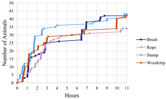 Kaplan–Meier curves indicating the latency for cattle to interact with different enrichments (brush, rope, stump, woodchip pile) during the first 11 h on Day 1 across 8 cattle groups (total animals = 56). Each point represents an individual’s first interaction with an enrichment.