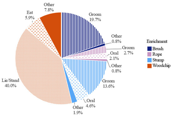 Duration spent performing specific behaviours on different enrichments, as a percentage of total time spent interacting with enrichments, over all groups (n = 8) and observation days (n = 6) (total = 182 h).