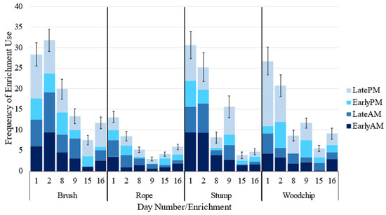 Given that an enrichment was used at least once during a time period, enrichment type influenced the frequency of enrichment use, with cattle interacting more frequently with the brush than the rope, but not the stump or woodchip pile (Table 4). Frequency of use decreased as day number increased, and was influenced by time period, with more interactions occurring in the morning than afternoon (Table 4). These patterns were also true when time periods where no interactions occurred were included (Figure 5). Weather also influenced frequency of use, with increasing rainfall and humidity resulting in decreasing use (Table 4).