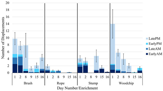 Mean number of daily displacements occurring at each enrichment, averaged across eight groups of seven cattle (±standard error for the day).