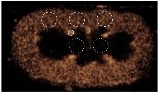 Intra- and inter-observer variation can be minimized by adherence to a standardized procedure in which operator dependent factors are controlled. However, no consensus guidelines for renal perfusion quantification by CEUS are available in veterinary medicine. Therefore, divergent CEUS protocols can be found in literature, especially regarding ROI selection. In particular, the number, size, and placement of the ROIs drawn in the different renal areas varies between studies [13,14,18,21,25,26,27]. In some studies, the ROI covered the entire cortex or medulla as well as possible [14,26,28]. In others, several smaller ROIs were drawn per renal area and their values were averaged [13,18]. One study used one larger ROI that did not fully enclose the cortex or medulla, rather than averaging multiple smaller ROIs [25]. However, each protocol seems to have a downside. Protocols in which the ROI does not encompass the entire cortex, medulla, or kidney still leave scope for arbitrary ROI placement, while the risk of inclusion of neighboring tissue and large blood vessels increases when the ROI covers an entire renal region.