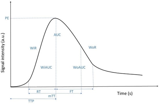 Schematic time intensity curve with illustration of the blood flow parameters. Peak enhancement (PE), wash-in area under the curve (WiAUC), wash-out area under the curve (WoAUC), total area under the curve (AUC), rise time (RT), mean transit time (mTTI), time to peak (TTP), wash-in rate (WiR), fall time (FT), and wash-out rate (WoR).
