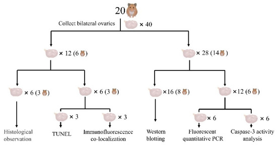 The hamsters were asphyxiated by CO2 at 22:00 on the last day before the experiment after being kept in the dark for at least 2 h. Immediately afterwards, the fresh blood was collected and the serum was extracted. Serum IGF-1, GnRH, FSH, and LH concentrations were determined by the enzyme-linked immunosorbent assay (ELISA) (Shanghai Jining Biotechnology Co., Ltd., JN01331, JN07049, JN02022, JN00518, Shanghai, China). All ovaries were collected and weighed. The ovaries of six hamsters in each group were fixed with 4% paraformaldehyde phosphate-buffered fixation solution for the prepared paraffin and frozen-sections. The bilateral ovaries of three hamsters were used for the histological observation by hematoxylin and eosin (H&E) staining, while the left and right ovaries of the remaining three hamsters were used for terminal deoxynucleotidyl transferase biotin-dUTP nick end labeling (TUNEL) and immunofluorescence co-localization, respectively. The remaining 14 hamsters in each group had their ovaries frozen in liquid nitrogen and then maintained at −80 °C. Among them, the bilateral ovaries of eight hamsters were used for western blotting, while the left and right ovaries of the other six hamsters were used for the fluorescent quantitative polymerase chain reaction (PCR) and the caspase-3 activity analysis, respectively. The ovarian experimental design is shown in Figure 1.