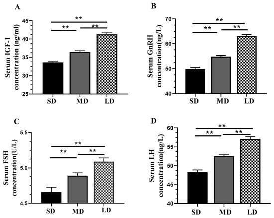The serum concentrations of the hormones, including IGF-1, GnRH, FSH, and LH, increased with the increasing illumination periods (Figure 2A–D), with significantly higher (p < 0.01) levels in the LD group and significantly lower levels in the SD group.