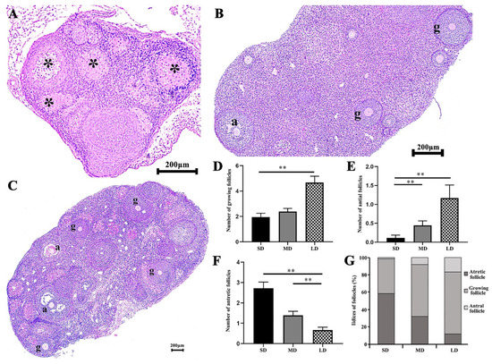 Differences in the number of follicles by the H&E staining of the ovaries of Phodopus sungorus under different photoperiods. (A) Ovarian section from the SD individuals. (B) Ovarian section from the MD individuals. (C) Ovarian section from the LD individuals. (D) Differences in the number of growing follicles across the different photoperiods. (E) Differences in the number of antral follicles across the different photoperiods. (F) Differences in the number of atretic follicles across the different photoperiods. (G) Indices of the growing follicles, antral and atretic follicles under the different photoperiods. g, growing follicle; a, antral follicle; *, atretic follicle. Values are means ± SEM. Bar = 200 μm; n = 3. SD, short daylight; MD, moderate daylight; LD, long daylight. * p < 0.05, ** p < 0.01.