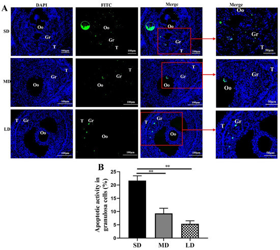 The results of the TUNEL staining provided direct evidence of the cell apoptosis (Figure 4), with green fluorescence (indicating DNA fragmentation), mainly appearing in the granulosa cells. With the increase in the duration of light, the green fluorescence of the granulosa cells in the ovarian follicles decreased significantly. Significant differences in the granulosa cell apoptosis were observed across the different photoperiods. The highest and lowest levels of granulosa cell apoptosis were detected in the SD and LD groups, respectively, and the apoptosis activity of the granulosa cells in the SD group was significantly higher than that in the MD and LD groups (p < 0.01), indicating that the LD was the most beneficial photoperiod for the follicle development.